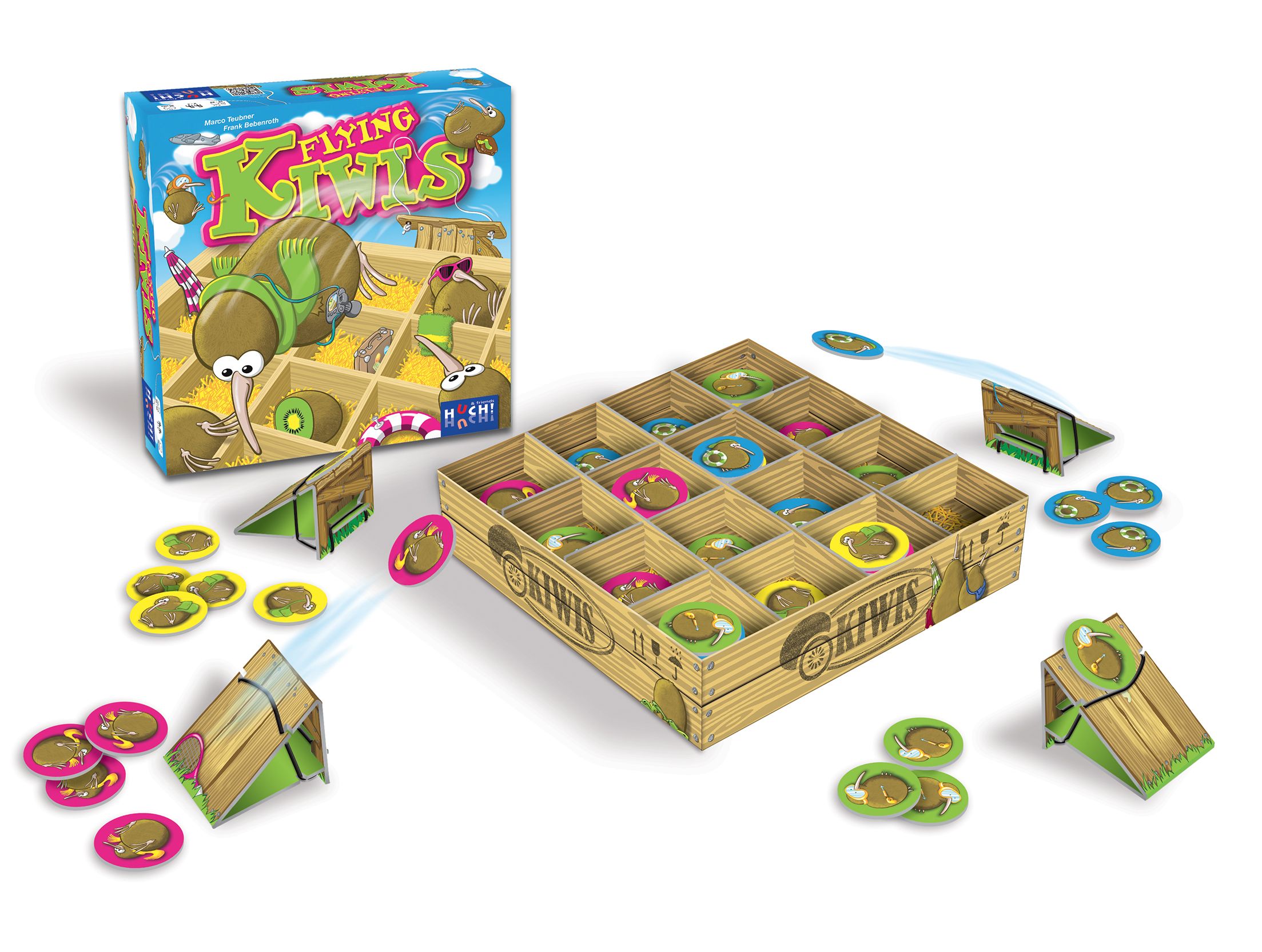 Chacun avec sa catapulte, vous allez essayer de former un rectangle de 4 dans la boite à kiwis. Recouvrez les kiwis des autres pour leur mettre des bâtons dans les roues !