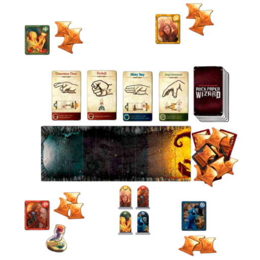 Dans Pierre Papier Magicien, les joueurs sont des sorciers venant tout juste de tuer un puissant dragon. Mais au moment où leurs yeux se tournent vers le trésor, une violente convoitise s’empare d’eux! Alors que leurs doigts se placent lentement pour former des gestes arcaniques, le repaire du dragon explose soudainement à nouveau de cris et de furie!