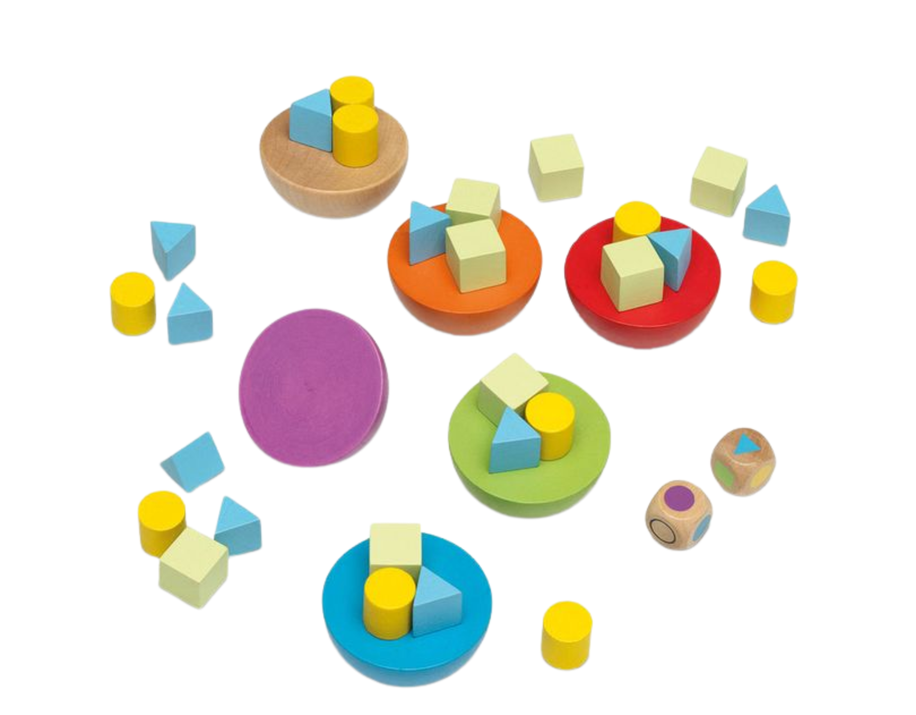 Get ready!, calm down!, yous hould place the pieces of various shapes on the coloured bases dictated by the dice, but be careful the base should not swing to avoid knocking down the pieces.