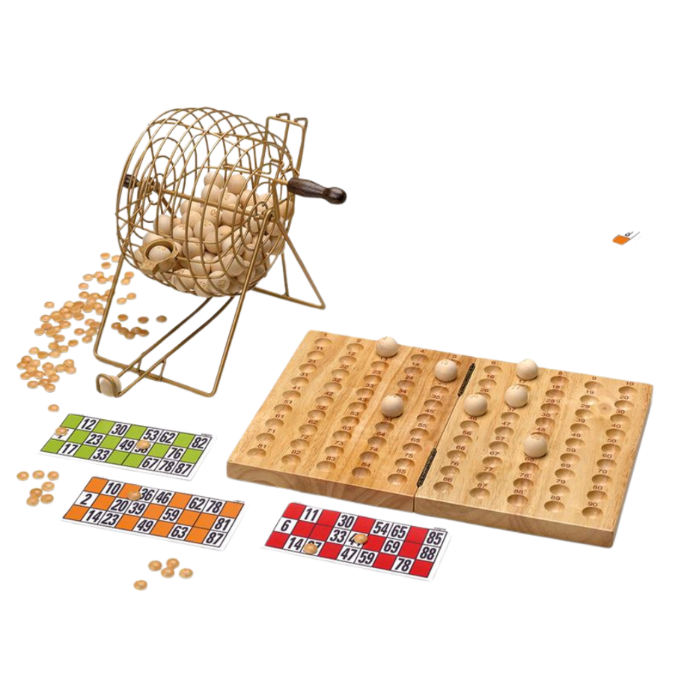 Enjoy your Bingo games with this luxury set including a solid wooden board designed to display de wood balls coming out of the metal ball cage.