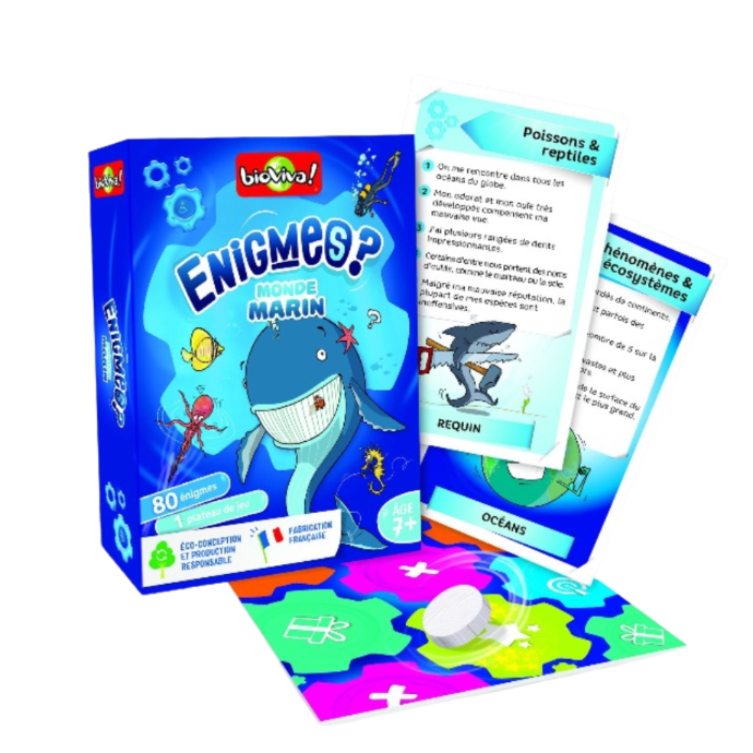 Serez-vous le plus rapide à deviner les animaux, phénomènes et autres merveilles du milieu mari qui se cachent derrière les 5 indices ? Attention ! Il vous faudra aussi faire preuve d’adresse en lançant le jeton sur le plateau pour gagner (ou non) plus de cartes…